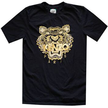 Любой мужчина будет выглядеть очень стильно в такой футболке от бренда KENZO. Она сшита из высококачественного хлопкового материала в базовом черном цвете. Отлично сочетается с другой одеждой и подходит для носки в любое время года. Футболка прямого покроя, поэтому идеально выглядит на любой фигуре. На передней части ее украшает большой вышитый золотыми нитками логотип бренда. Такой дизайн непременно привлечет всеобщее внимание.