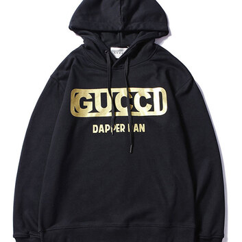 Такая модная толстовка пригодится современному мужчине в любую пору года. Она удобная, легкая и очень хорошо комбинируется с другой одеждой в спортивном или повседневном стиле. Пошитая из приятного к телу материала в универсальном черном цвете. Оснащена глубоким капюшоном и вставками из эластичной манжетной резинки на рукавах и поясе. Сзади она является однотонной, а вот спереди - декорирована стильным принтом золотого цвета, на котором нанесена надпись "Gucci", а также еще одна надпись с названием известного английского бренда Dapper Dan.