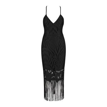 Кружевное платье черного цвета имеет приталенный сон. Декольте на модели открытое. Тонкие бретели сшиты из той же ткани, что и сама модель. Платье красиво сочетается с пальто приталенного фасона. Босоножки серебряного оттенка красиво смотрятся с платьем. В нижней части модели сшита полоска из тонких веревочек, которые украшают платье. Изделие сшито из качественной ткани. Размеры: S, M.